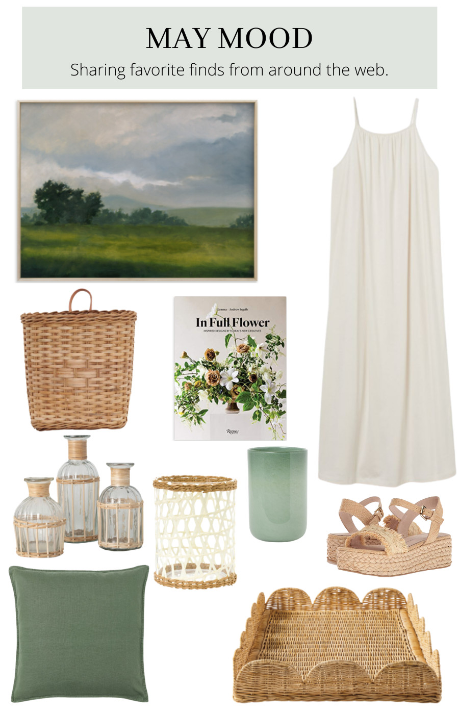 Now that warm weather seems to be here to stay, and we all are wanting to spend more time outdoors, it’s the perfect time to bring in natural textures, green glass, and easy-breezy fabrics. Bamboo and raffia-covered vases are perfect vessels for holding freshly cut flowers from the garden. Hanging wicker baskets full of hydrangeas (which will be here before we know it) just speak spring. Update those winter pillows with linen pillow covers. These are a steal and come in lots of colors! I’m dreaming of entertaining on the patio in this flowy maxi dress. Happy May!